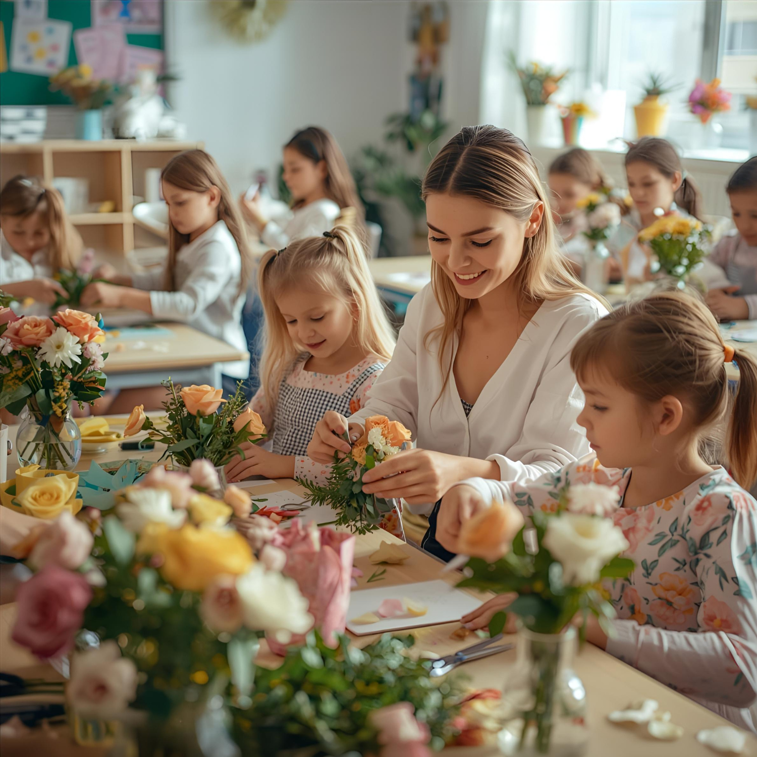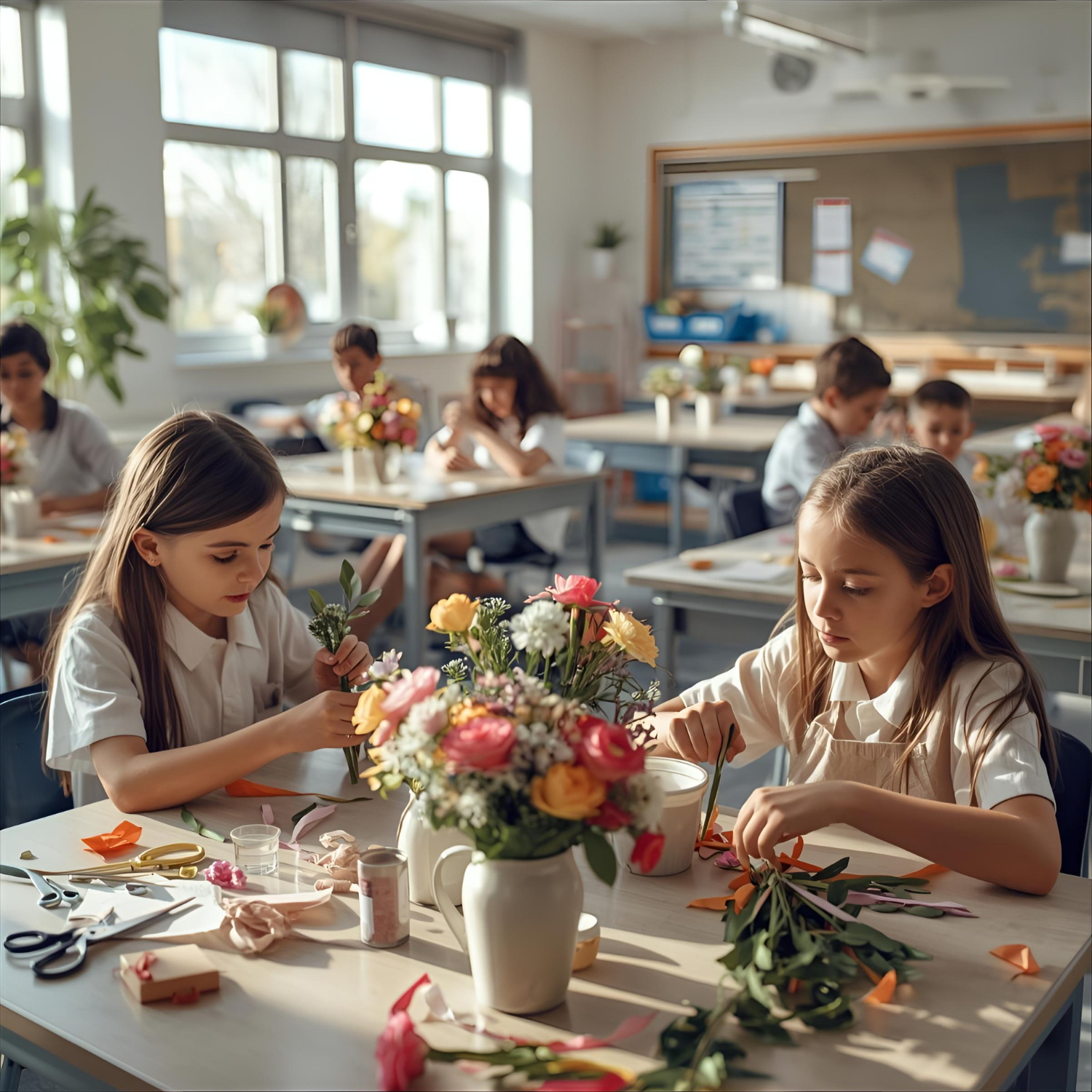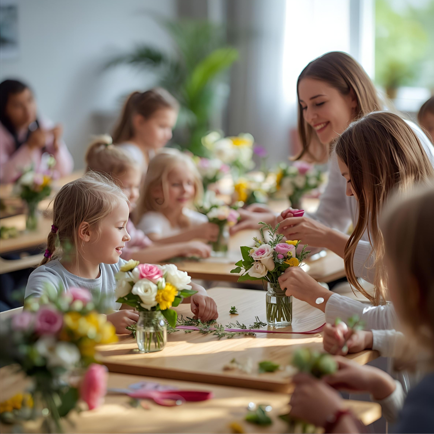 Groups typically include five to eight students, with one florist facilitator and one to two supporting adults such as teachers or aides. Sessions last between thirty and forty-five minutes, adjusted according to age and focus levels.
