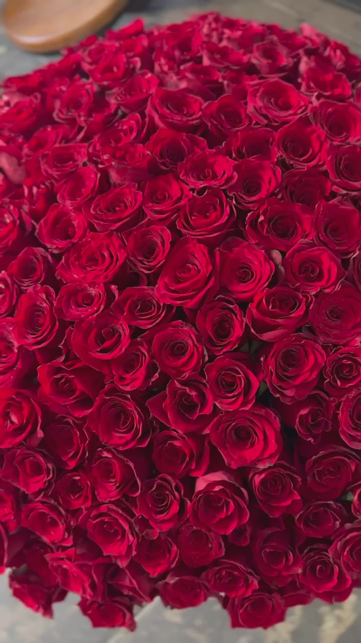 A bouquet of 250 fresh red roses arranged to leave unforgettable impression.