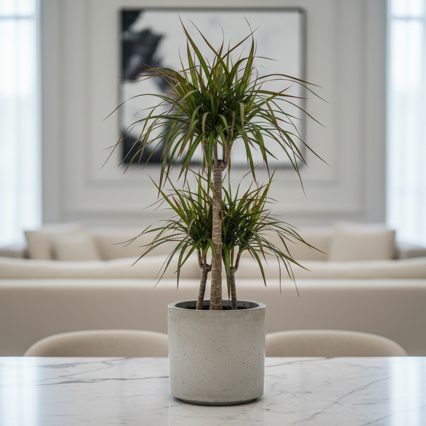 Dragon tree is a popular indoor plant with long green leaves and a clean vertical look. It works well in modern homes and offices and does not require complex care. A great option for adding greenery to a room without taking up much space.
