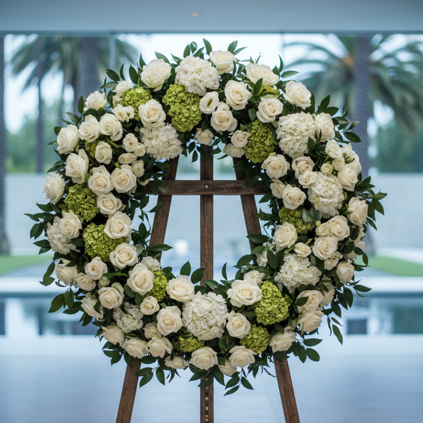 Full standing funeral wreath featuring French roses, mini mums, hydrangea, orchids, and fresh greenery arranged in a soft garden style. The circular design represents remembrance and creates a beautiful floral tribute during memorial ceremonies. Displayed on a standing easel and available for funeral flower delivery in Los Angeles. Flower shades may vary depending on stock.