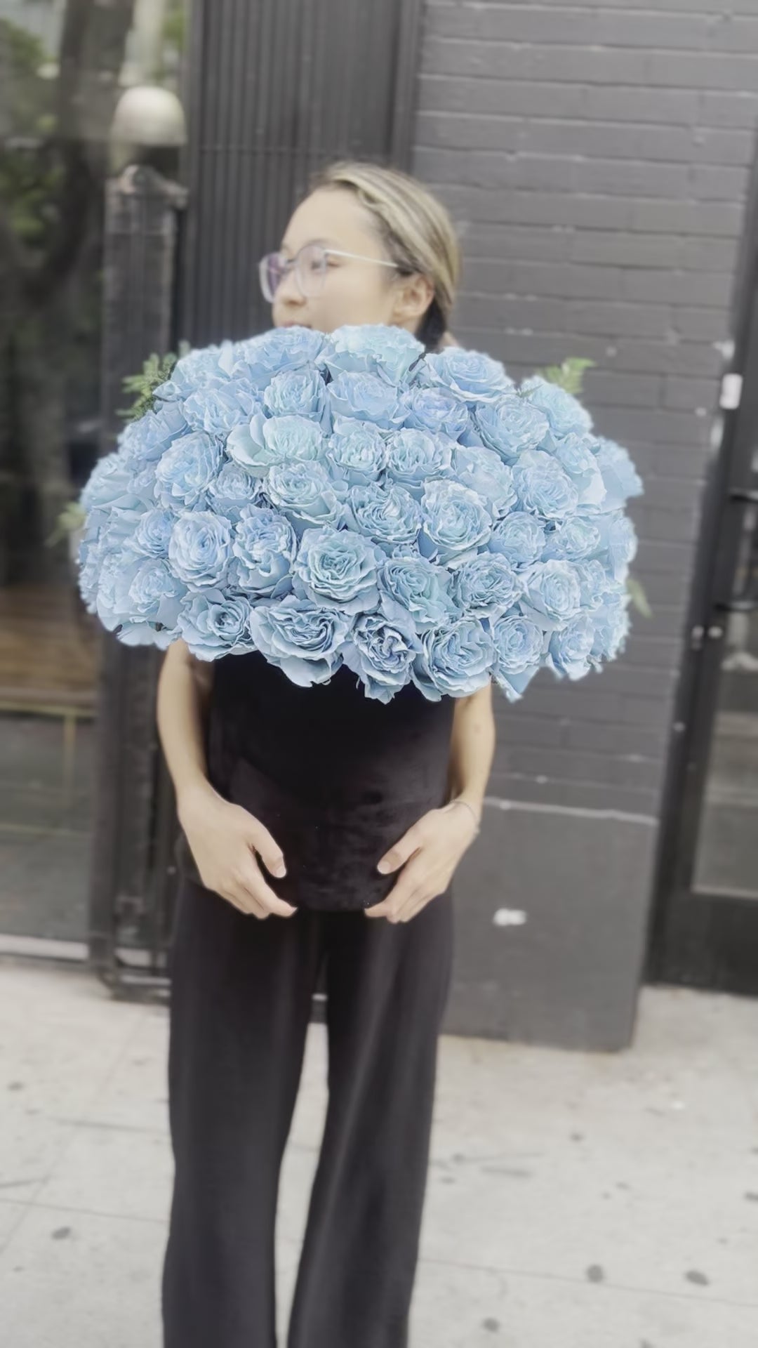 Flower arrangement in a velvet box with 50 blue roses. This design is a popular option for anniversaries, gender reveals, or creative birthday gifts.